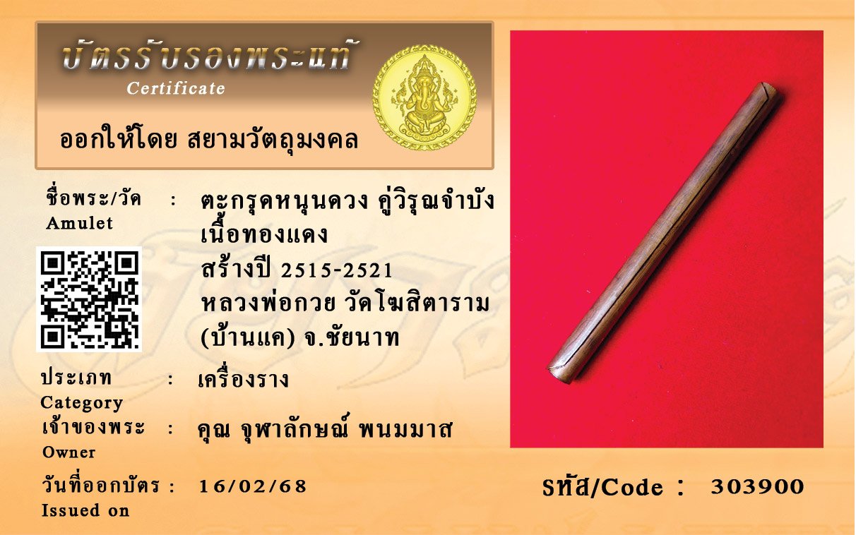 รหัสสินค้า : 303900 ตะกรุดหนุนดวง คู่วิรุณจำบัง เนื้อทองแดง สร้างปี 2515-2521 หลวงพ่อกวย วัดโฆสิตาราม (บ้านแค) จ.ชัยนาท