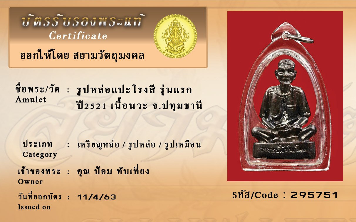 รหัสสินค้า : (295751) รูปหล่อแปะโรงสี รุ่นแรก ปี2521 เนื้อนวะ จ.ปทุมธานี