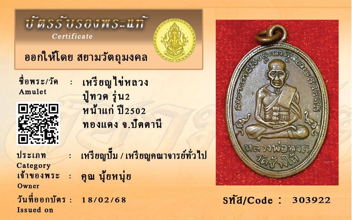 รหัสสินค้า : 303922 เหรียญไข่หลวง ปู่ทวด รุ่น2 หน้าแก่ ปี2502 ทองแดง จ.ปัตตานี