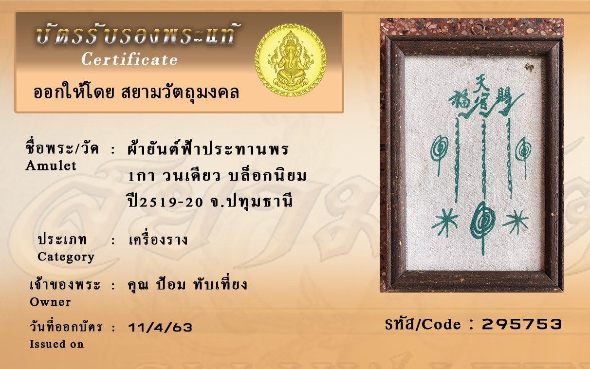 รหัสสินค้า : (295753) ผ้ายันต์ฟ้าประทานพร 1กา วนเดียว บล็อกนิยม ปี2519-20 จ.ปทุมธานี