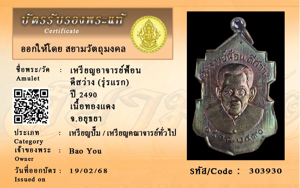 รหัสสินค้า : 303930 เหรียญอาจารย์ฟ้อน ดีสว่าง (รุ่รแรก) ปี 2490 เนื้อทองแดง จ.อยุธยา