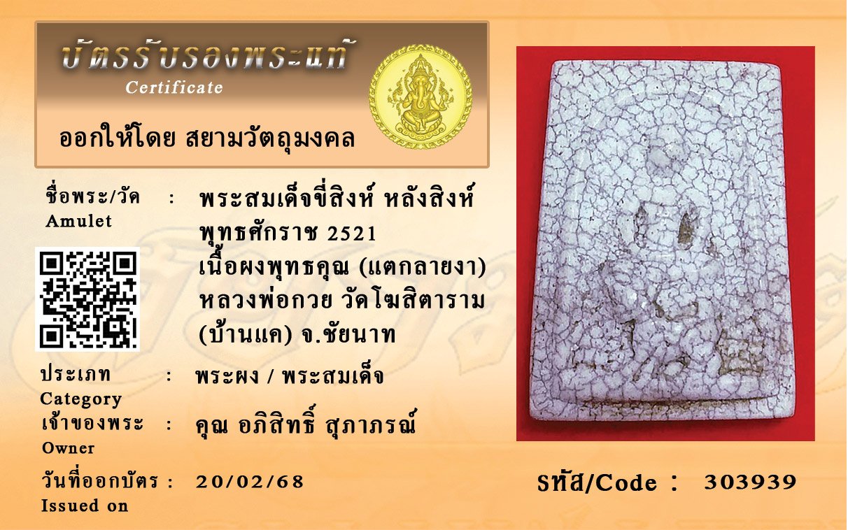 รหัสสินค้า : 303939 พระสมเด็จขี่สิงห์ หลังสิงห์ พุทธศักราช 2521 เนื้อผงพุทธคุณ (แตกลายงา) หลวงพ่อกวย วัดโฆสิตาราม (บ้านแค) จ.ชัยนาท