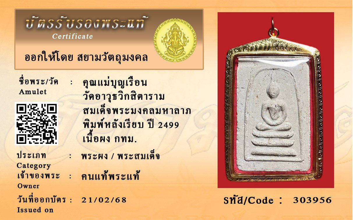 รหัสสินค้า : 303956 คุณแม่บุญเรือน วัดอาวุธวิกสิตาราม สมเด็จพระมงคลมหาลาภ พิมพ์หลังเรียบ ปี 2499 เนื้อผง กทม.