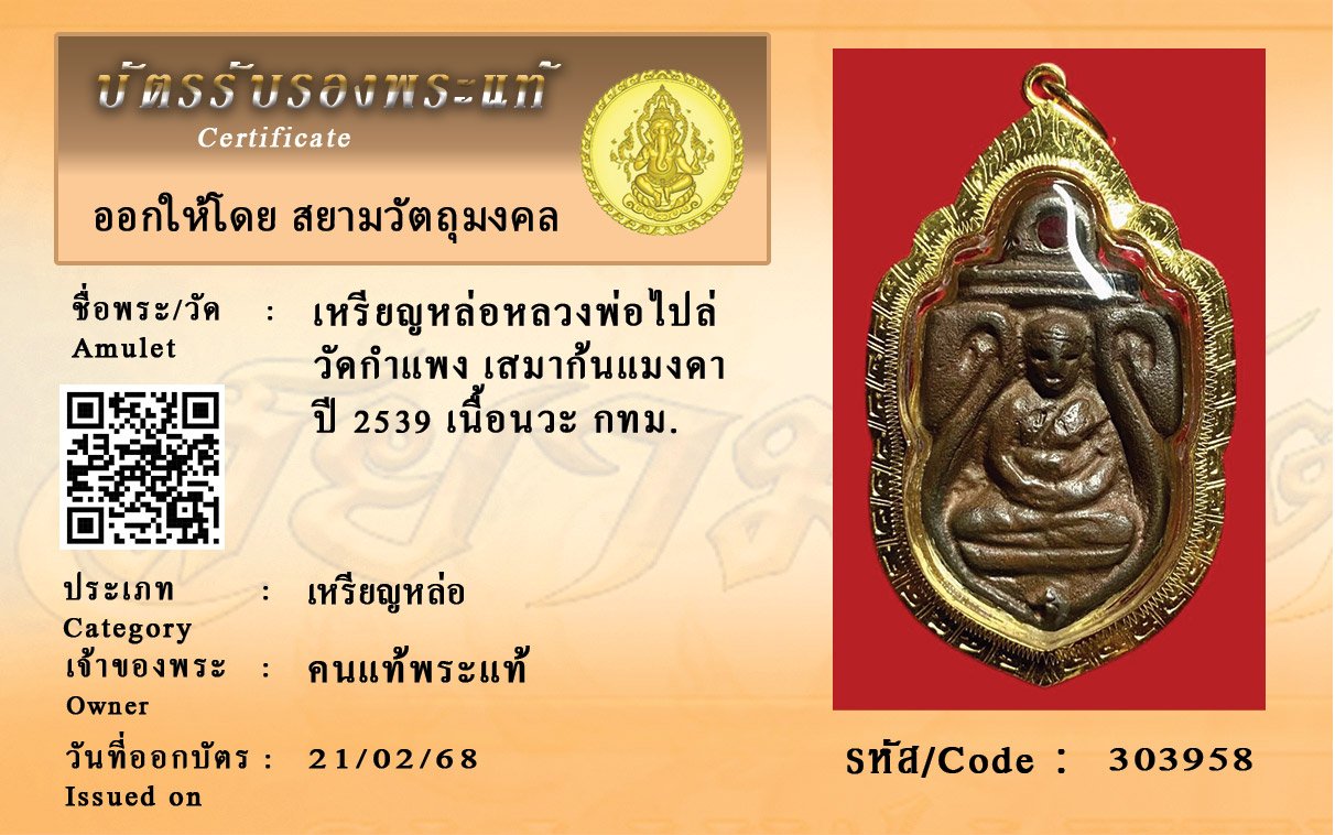 รหัสสินค้า : 303958 เหรียญหล่อหลวงพ่อไปล่ วัดกำแพง เสมาก้นแมงดา ปี 2539 เนื้อนวะ กทม.