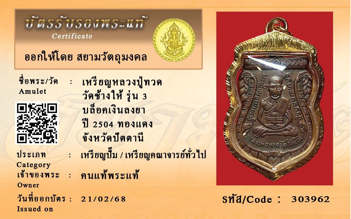 รหัสสินค้า : 303962 เหรียญหลวงปู่ทวด วัดช้างให้ รุ่น 3 บล็อคเงินลงยา ปี 2504 ทองแดง จังหวัดปัตตานี