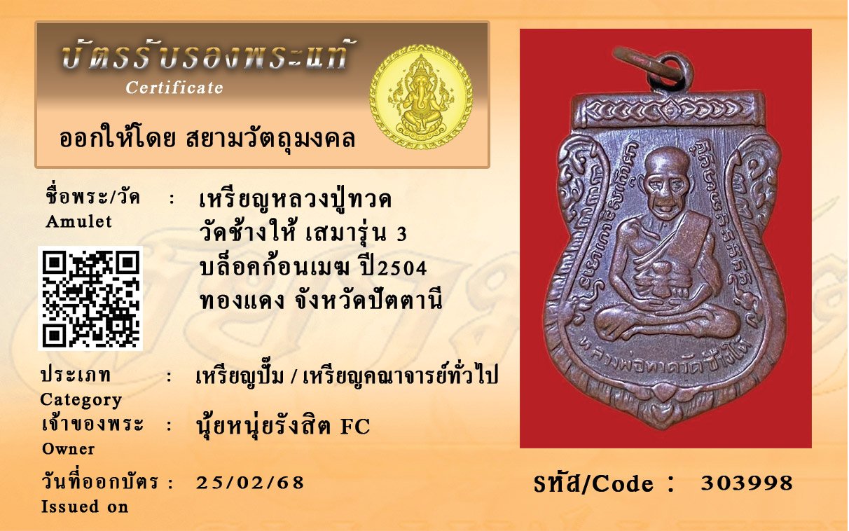รหัสสินค้า : 303998 เหรียญหลวงปู่ทวด วัดช้างให้ เสมารุ่น 3 บล็อคก้อนเมฆ ปี2504 ทองแดง จังหวัดปัตตานี