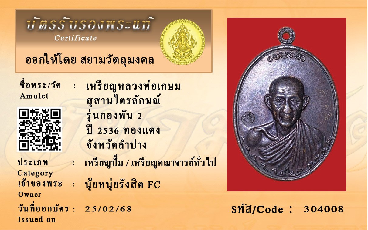 รหัสสินค้า : 304008 เหรียญหลวงพ่อเกษม สุสานไตรลักษณ์ รุ่นกองพัน 2 ปี 2536 ทองแดง จังหวัดลำปาง