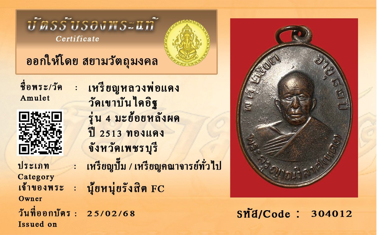 รหัสสินค้า : 304012 เหรียญหลวงพ่อแดง วัดเขาบันไดอิฐ รุ่น 4 มะย้อยหลังผด ปี 2513 ทองแดง จังหวัดเพชรบุรี