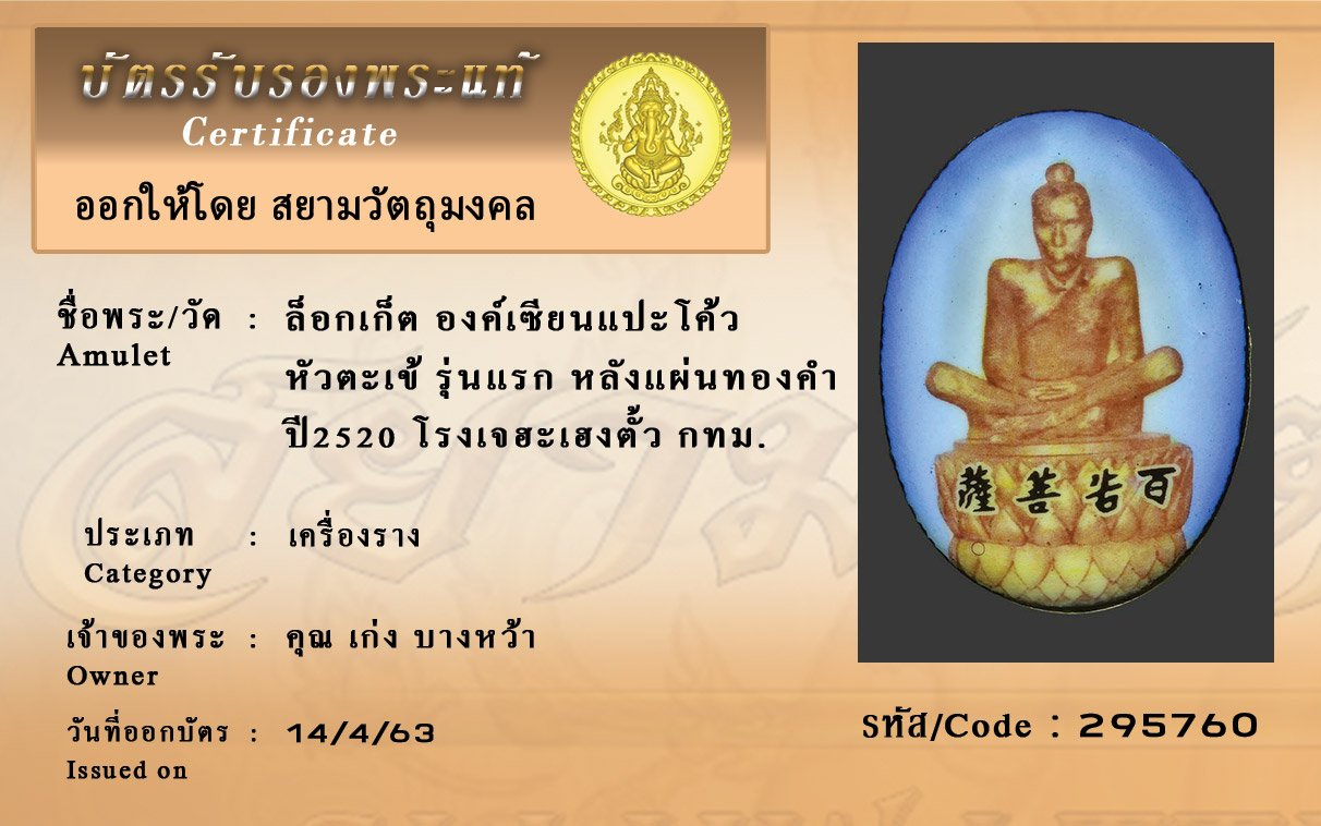 รหัสสินค้า : (295760) ล็อกเก็ต องค์เซียนแปะโค้ว หัวตะเข้ รุ่นแรก หลังแผ่นทองคำ ปี2520 โรงเจฮะเฮงตั้ว กทม.