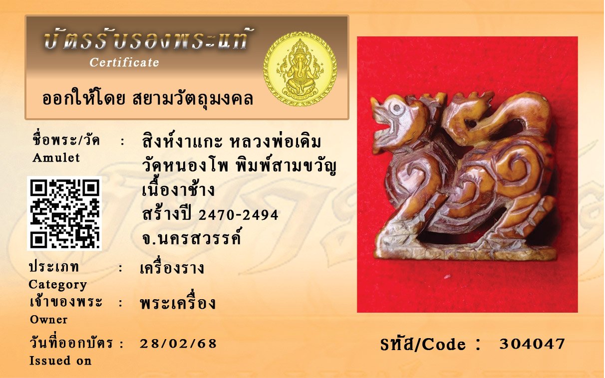 รหัสสินค้า : 304047 สิงห์งาแกะ หลวงพ่อเดิม วัดหนองโพ พิมพ์สามขวัญ เนื้องาช้าง สร้างปี 2470-2494 จ.นครสวรรค์