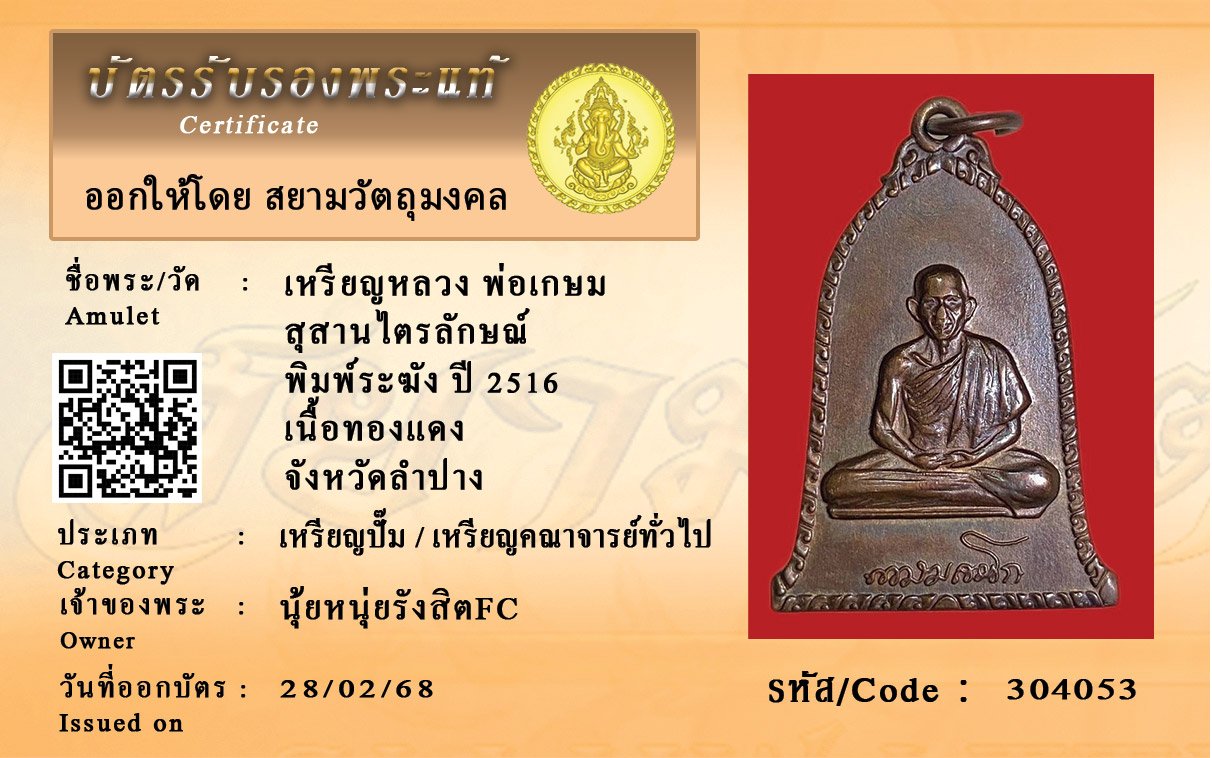 รหัสสินค้า : 304053 เหรียญหลวง พ่อเกษม สุสานไตรลักษณ์ พิมพ์ระฆัง ปี 2516 เนื้อทองแดง จังหวัดลำปาง