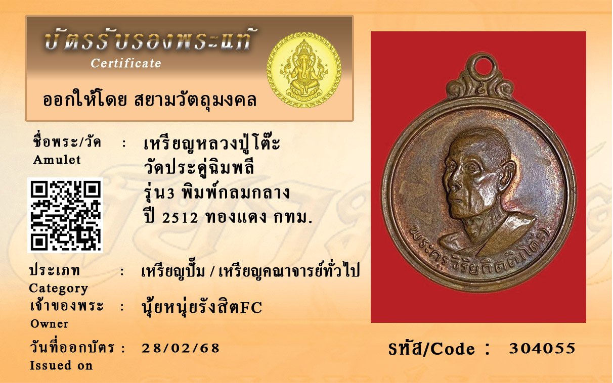 รหัสสินค้า : 304055 เหรียญหลวงปู่โต๊ะ วัดประดู่ฉิมพลี รุ่น3 พิมพ์กลมกลาง ปี 2512 ทองแดง กทม.