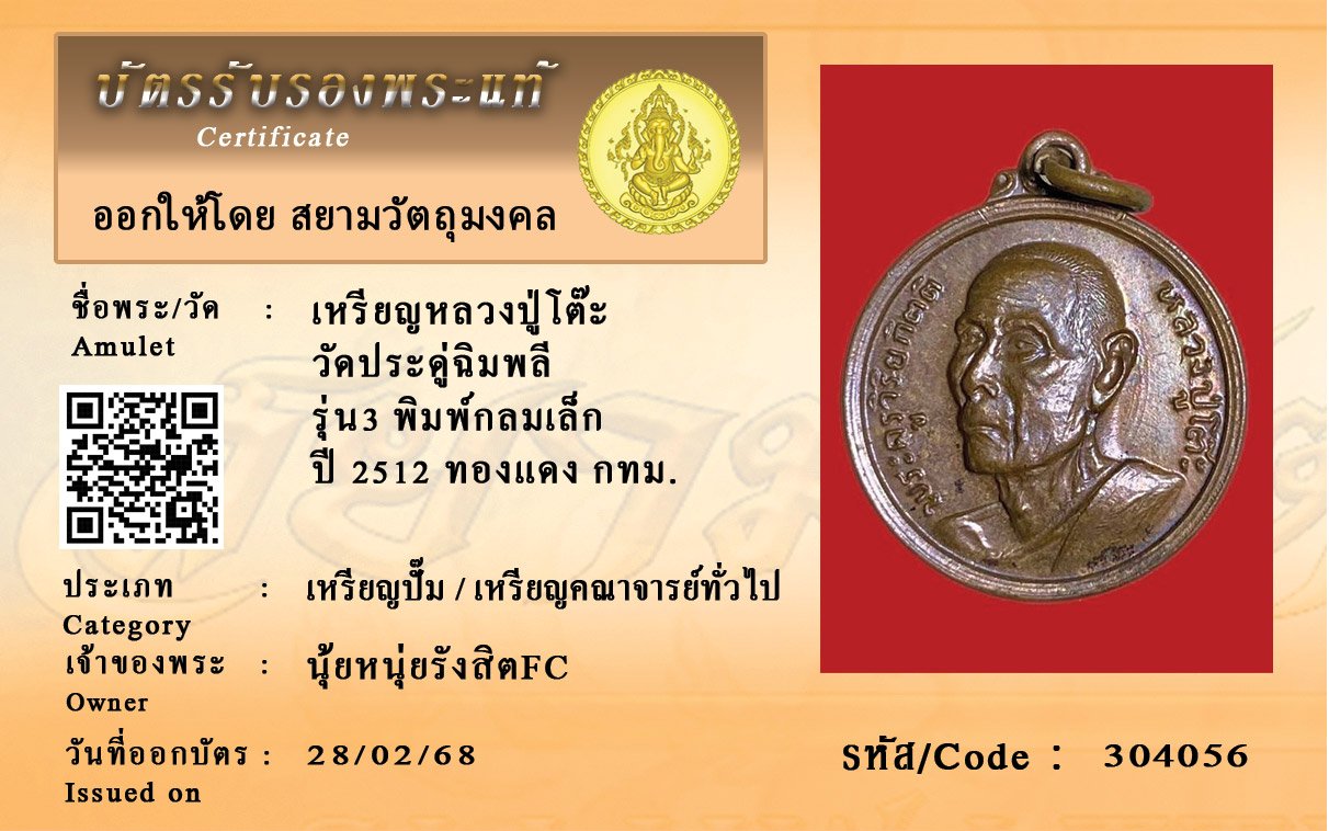 รหัสสินค้า : 304056 เหรียญหลวงปู่โต๊ะ วัดประดู่ฉิมพลี รุ่น3 พิมพ์กลมเล็ก ปี 2512 ทองแดง กทม.