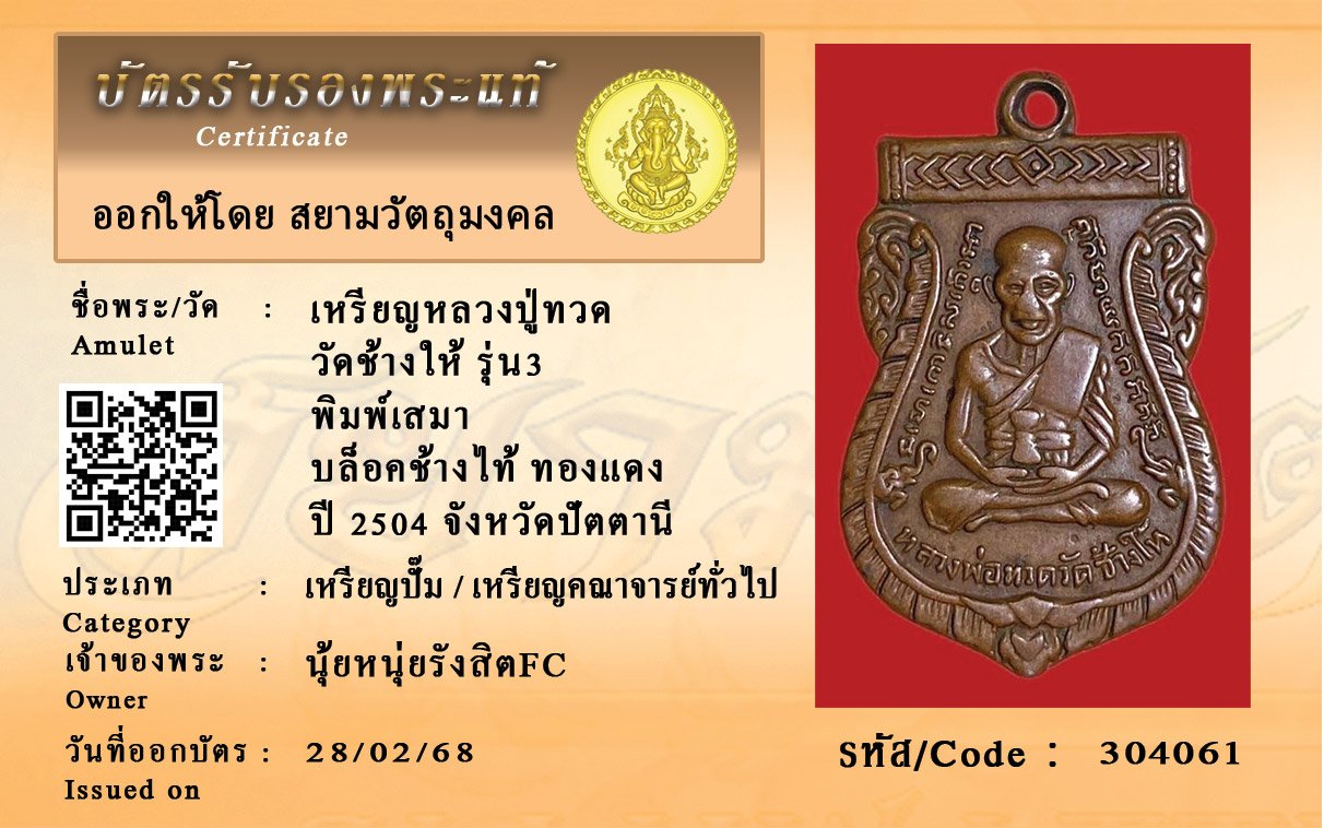 รหัสสินค้า : 304061 เหรียญหลวงปู่ทวด วัดช้างให้ รุ่น3 พิมพ์เสมา บล็อคช้างไท้ ทองแดง ปี 2504 จังหวัดปัตตานี