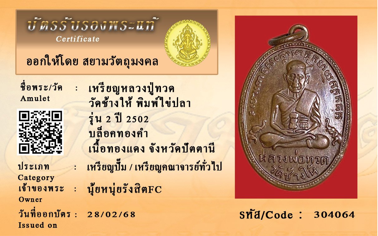 รหัสสินค้า : 304064 เหรียญหลวงปู่ทวด วัดช้างให้ พิมพ์ไข่ปลา รุ่น 2 ปี 2502 บล็อคทองคำ เนื้อทองแดง จังหวัดปัตตานี