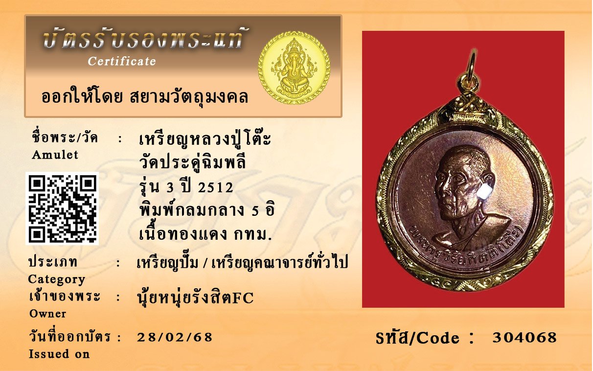 รหัสสินค้า : 304068 เหรียญหลวงปู่โต๊ะ วัดประดู่ฉิมพลี รุ่น 3 ปี 2512 พิมพ์กลมกลาง 5 อิ เนื้อทองแดง กทม.