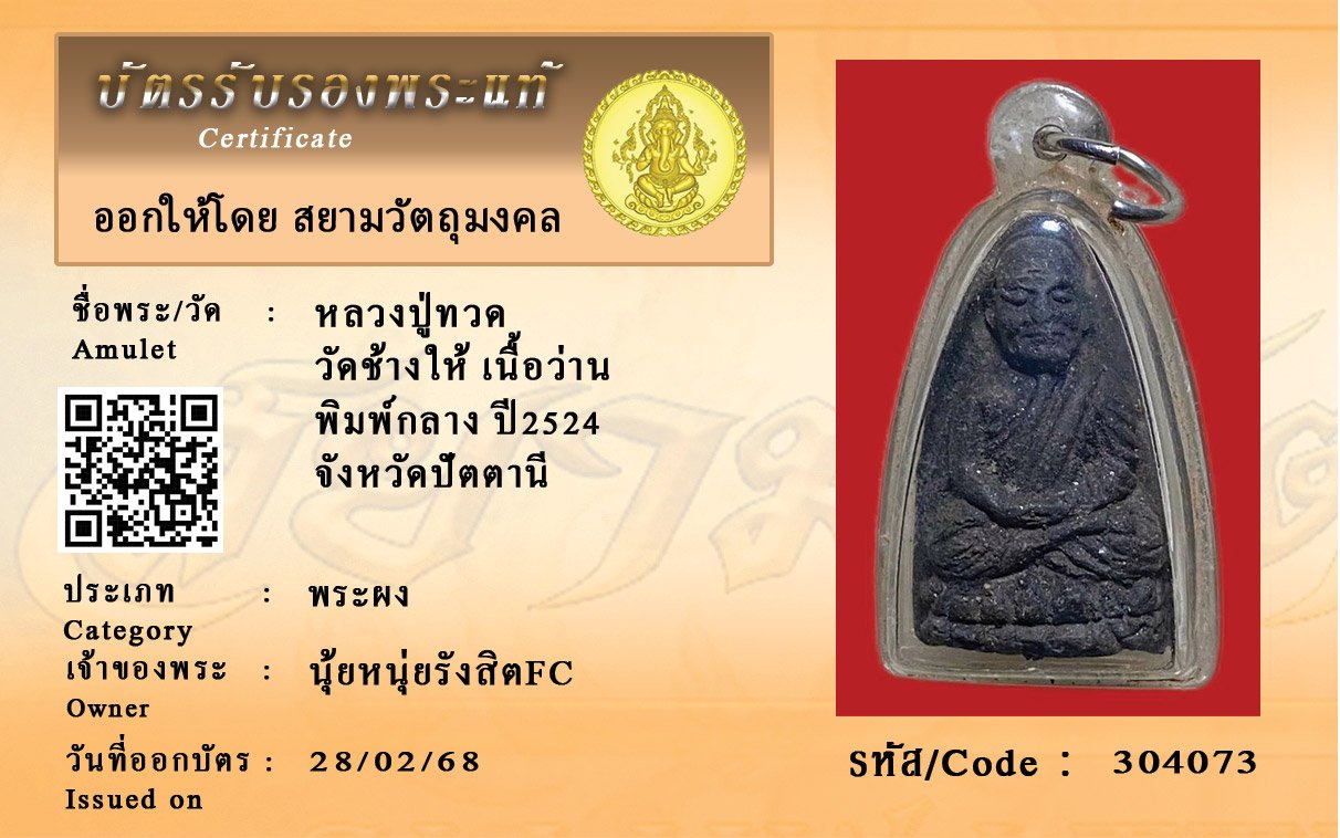 รหัสสินค้า : 304073 หลวงปู่ทวด วัดช้างให้ เนื้อว่าน พิมพ์กลาง ปี2524 จังหวัดปัตตานี