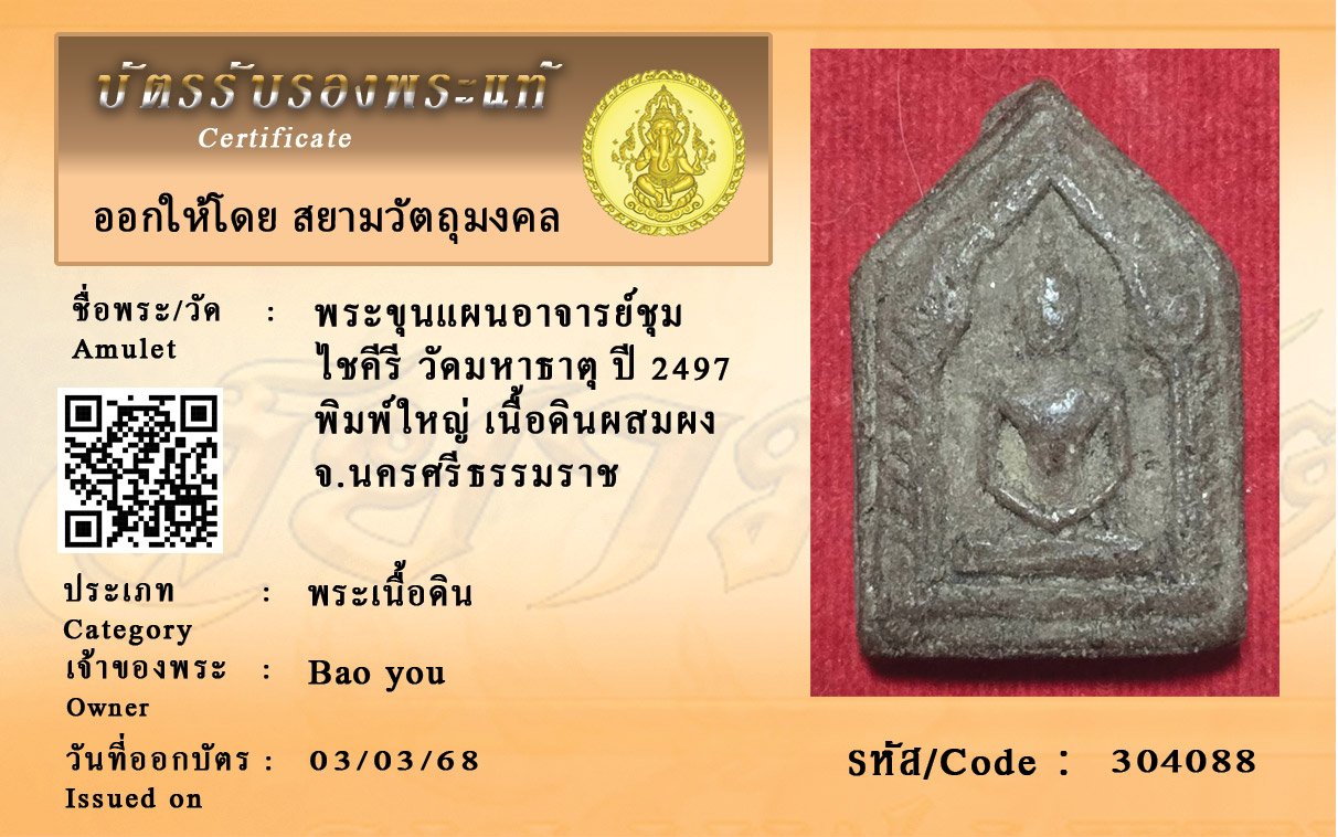รหัสสินค้า : 304088 พระขุนแผนอาจารย์ชุม ไชคีรี วัดมหาธาตุ ปี 2497 พิมพ์ใหญ่ เนื้อดินผสมผง จ.นครศรีธรรมราช