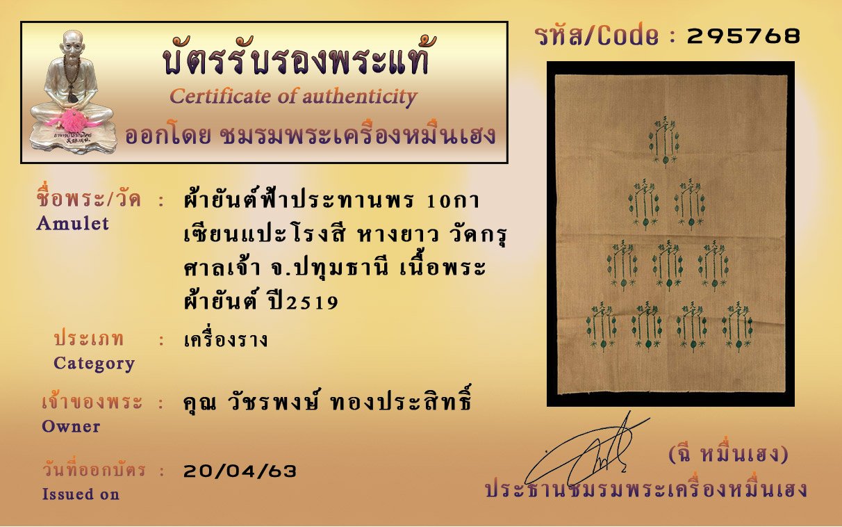 รหัสสินค้า : (295768) ผ้ายันต์ฟ้าประทานพร 10กา เซียนแปะโรงสี หางยาว วัดกรุ ศาลเจ้า จ.ปทุมธานี เนื้อพระ ผ้ายันต์ ปี2519
