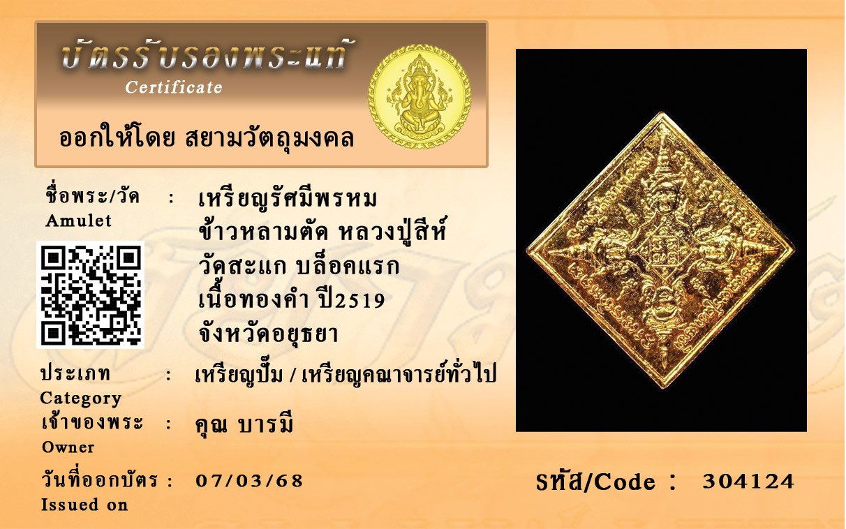 รหัสสินค้า : 304124 เหรียญรัศมีพรหม ข้าวหลามตัด หลวงปู่สีห์ วัดสะแก บล็อคแรก เนื้อทองคำ ปี2519 จังหวัดอยุธยา