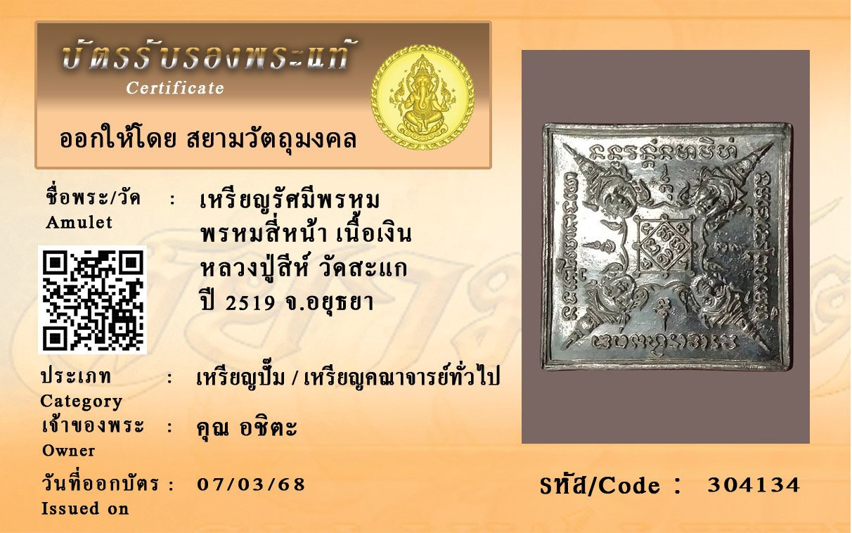 รหัสสินค้า : 304134 เหรียญรัศมีพรหม พรหมสี่หน้า เนื้อเงิน หลวงปู่สีห์ วัดสะแก ปี 2519 จ.อยุธยา