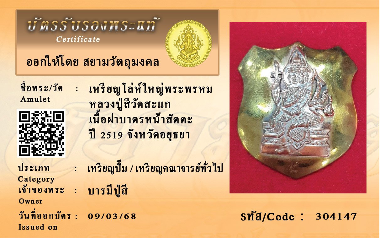 รหัสสินค้า : 304147 เหรียญโล่ห์ใหญ่พระพรหม หลวงปู่สีวัดสะแก เนื้อฝาบาตรหน้าสัตตะ ปี 2519 จังหวัดอยุธยา
