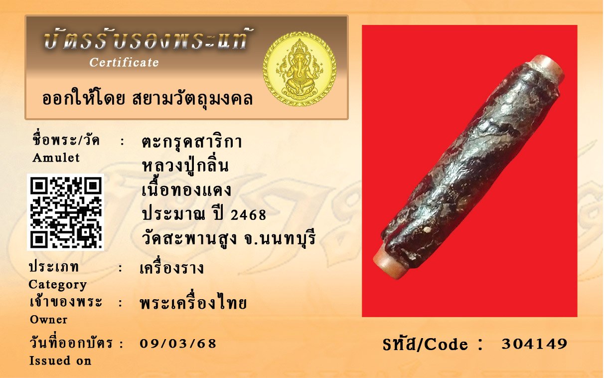 รหัสสินค้า : 304149 ตะกรุดสาริกา หลวงปู่กลิ่น เนื้อทองแดง ประมาณ ปี 2468 วัดสะพานสูง จ.นนทบุรี
