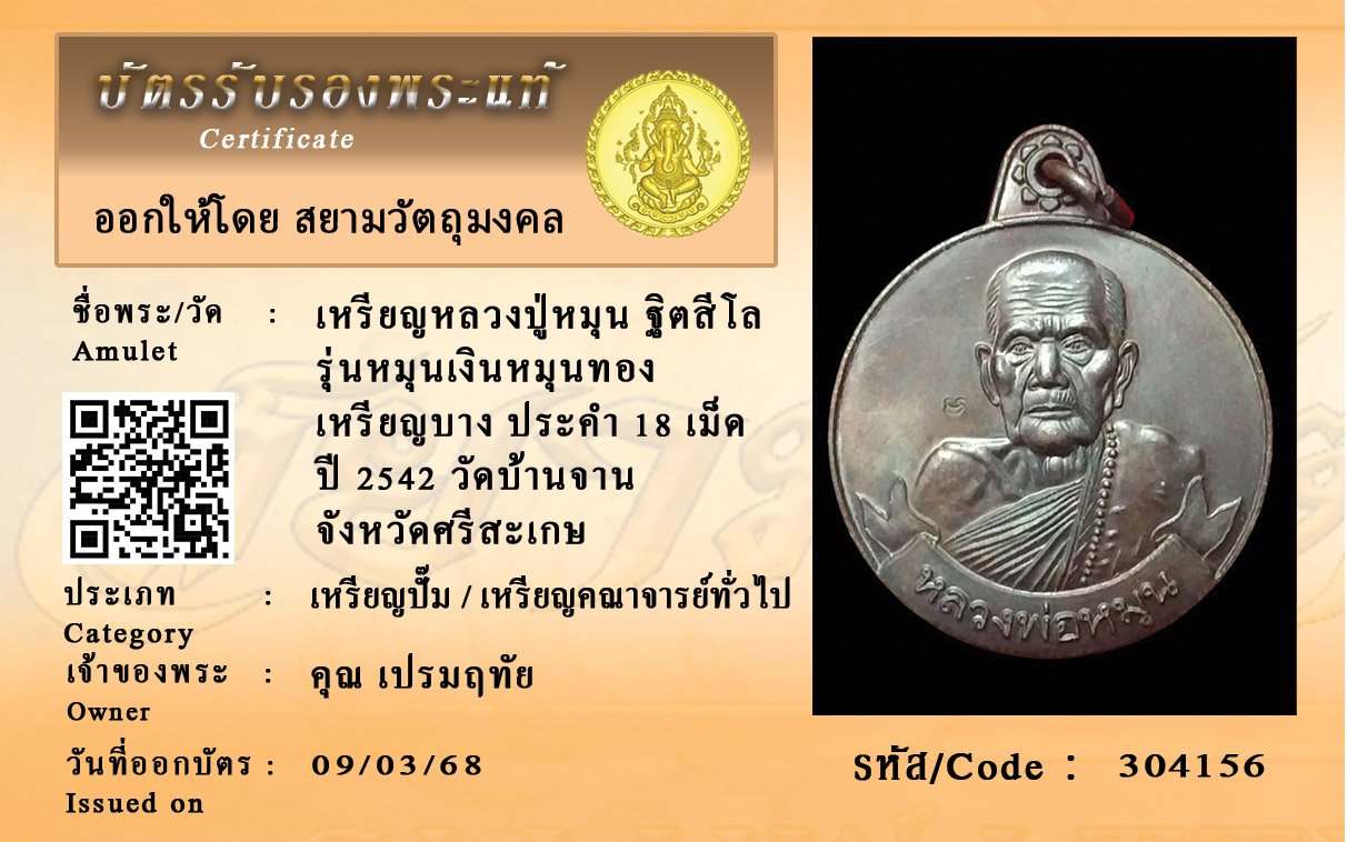 รหัสสินค้า : 304156 เหรียญหลวงปู่หมุน ฐิตสีโล รุ่นหมุนเงินหมุนทอง เหรียญบาง ประคำ 18 เม็ด ปี 2542 วัดบ้านจาน จังหวัดศรีสะเกษ