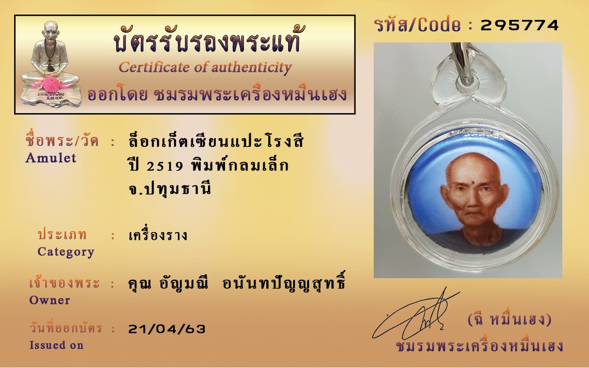 รหัสสินค้า : (295774) ล็อกเก็ตเซียนแปะโรงสี ปี 2519 พิมพ์กลมเล็ก จังหวัดปทุมธานี