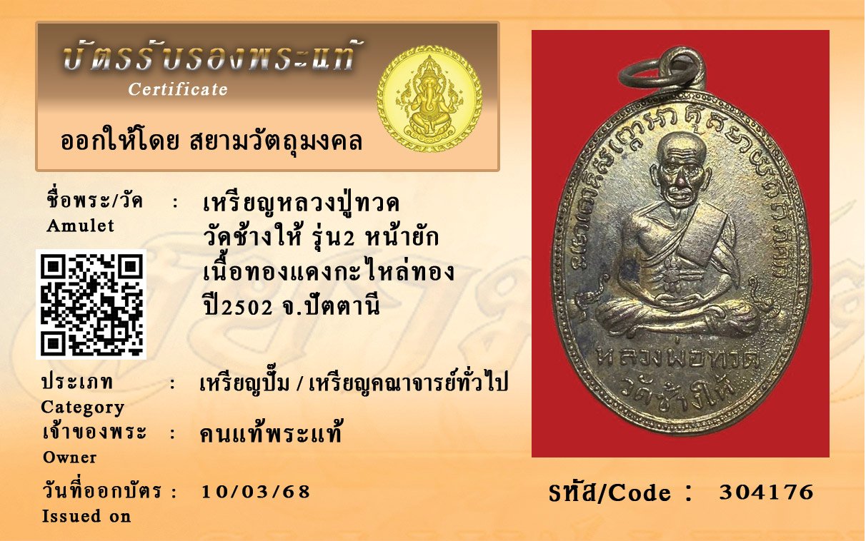 รหัสสินค้า : 304176 เหรียญหลวงปู่ทวด วัดช้างให้ รุ่น2 หน้ายัก เนื้อทองแดงกะไหล่ทอง ปี2502 จ.ปัตตานี