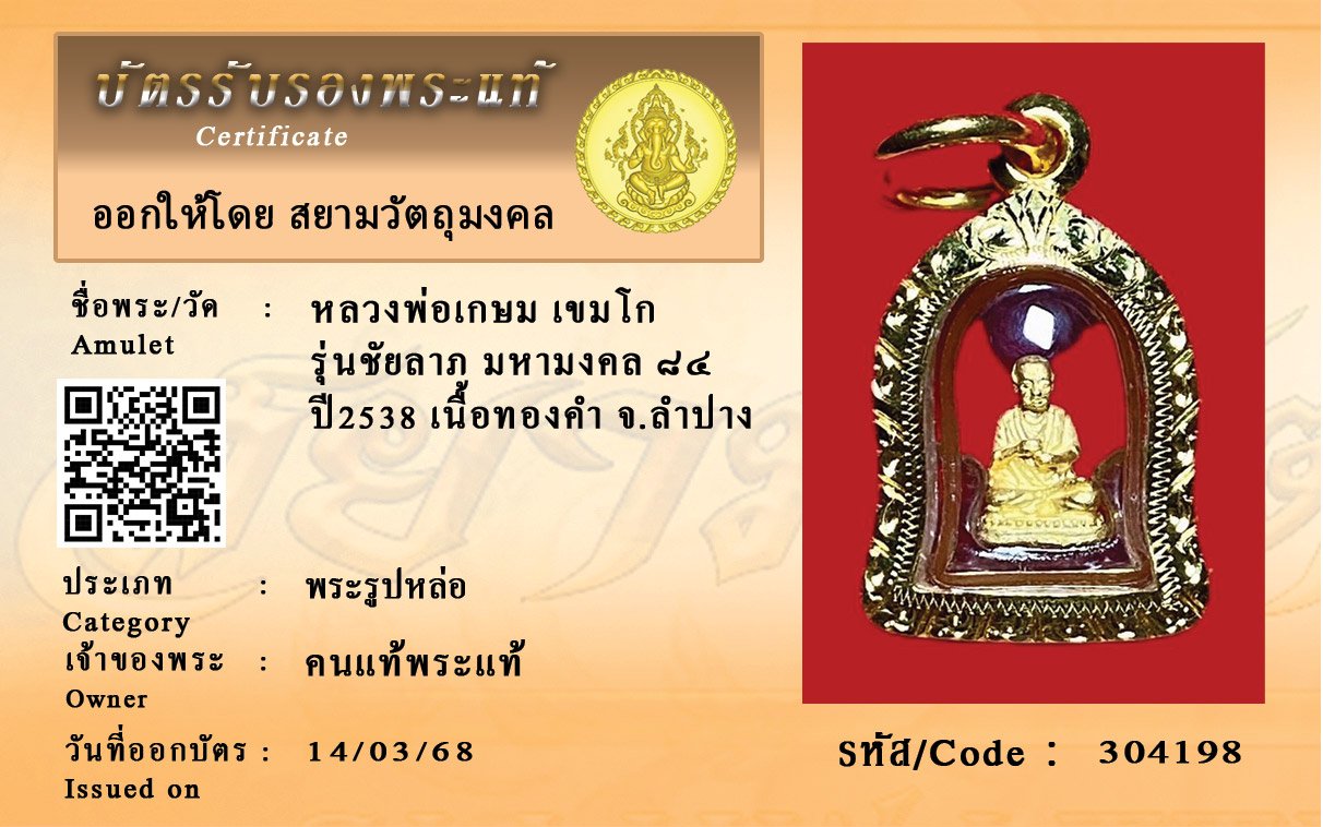 รหัสสินค้า : 304198 หลวงพ่อเกษม เขมโก รุ่นชัยลาภ มหามงคล ๘๔ ปี2538 เนื้อทองคำ จ.ลำปาง