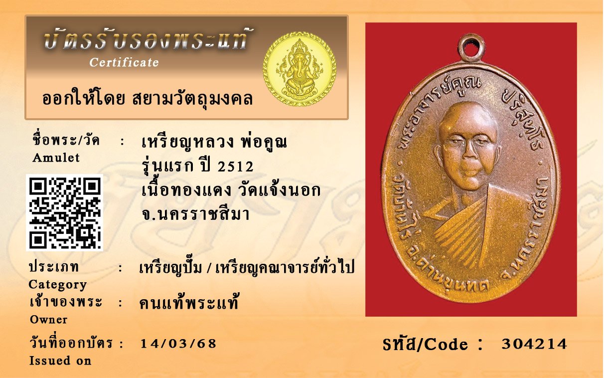 รหัสสินค้า : 304214 เหรียญหลวง พ่อคูณ รุ่นแรก ปี 2512 เนื้อทองแดง วัดแจ้งนอก จ.นครราชสีมา
