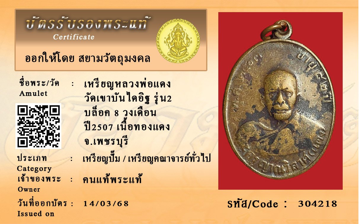 รหัสสินค้า : 304218 เหรียญหลวงพ่อแดง วัดเขาบันไดอิฐ รุ่น2 บล็อค 8 วงเดือน ปี2507 เนื้อทองแดง จ.เพชรบุรี