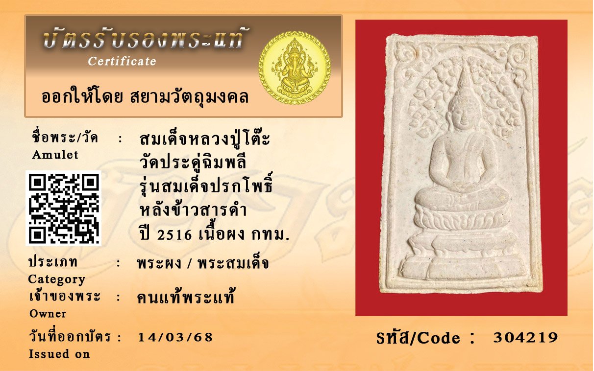 รหัสสินค้า : 304219 สมเด็จหลวงปู่โต๊ะ วัดประดู่ฉิมพลี รุ่นสมเด็จปรกโพธิ์ หลังข้าวสารดำ ปี 2516 เนื้อผง กทม.