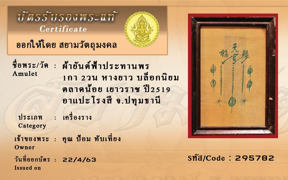 รหัสสินค้า : (295782) ผ้ายันต์ฟ้าประทานพร1กา 2วน หางยาว บล็อกนิยม ตลาดน้อย เยาวราช ปี2519 อาแปะโรงสี จ.ปทุมธานี