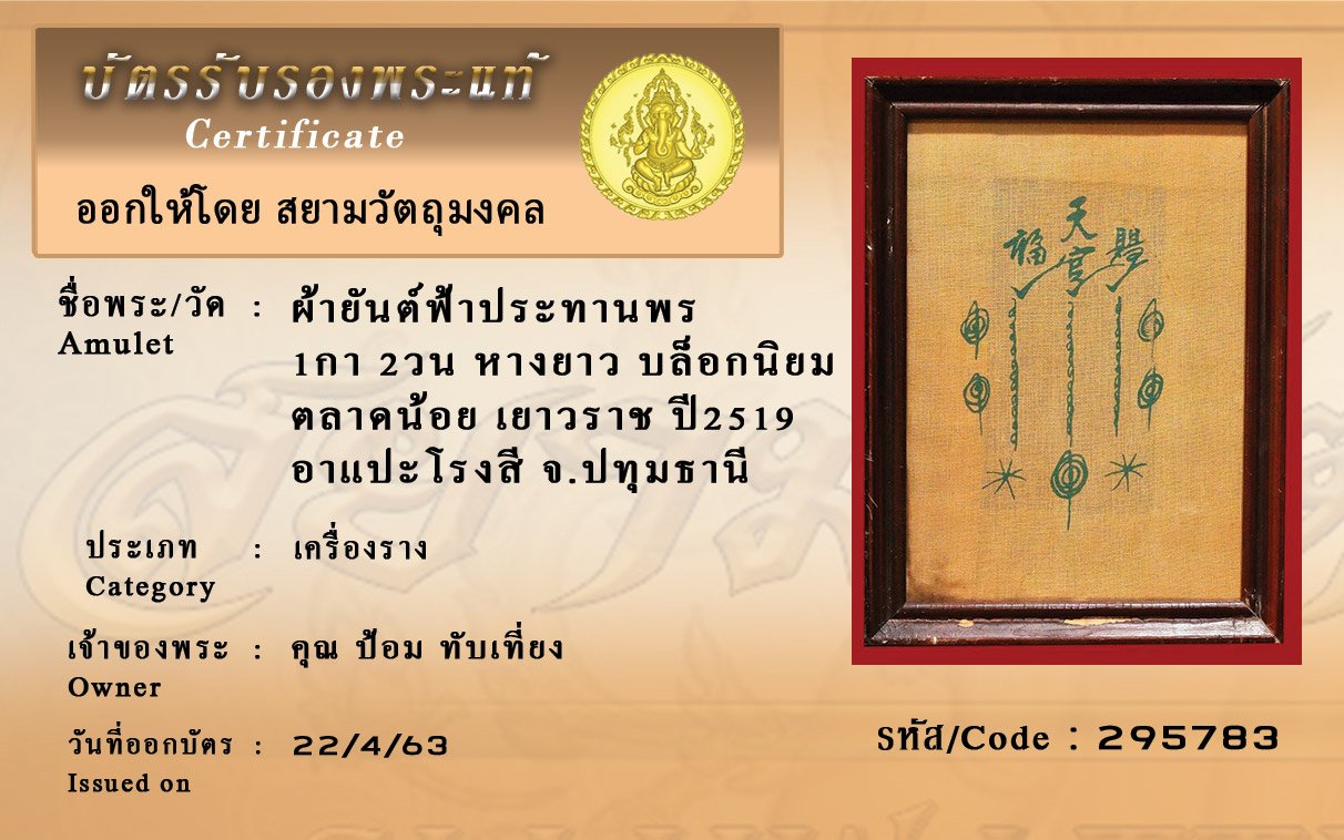 รหัสสินค้า : (295783) ผ้ายันต์ฟ้าประทานพร1กา 2วน หางยาว บล็อกนิยม ตลาดน้อย เยาวราช ปี2519 อาแปะโรงสี จ.ปทุมธานี