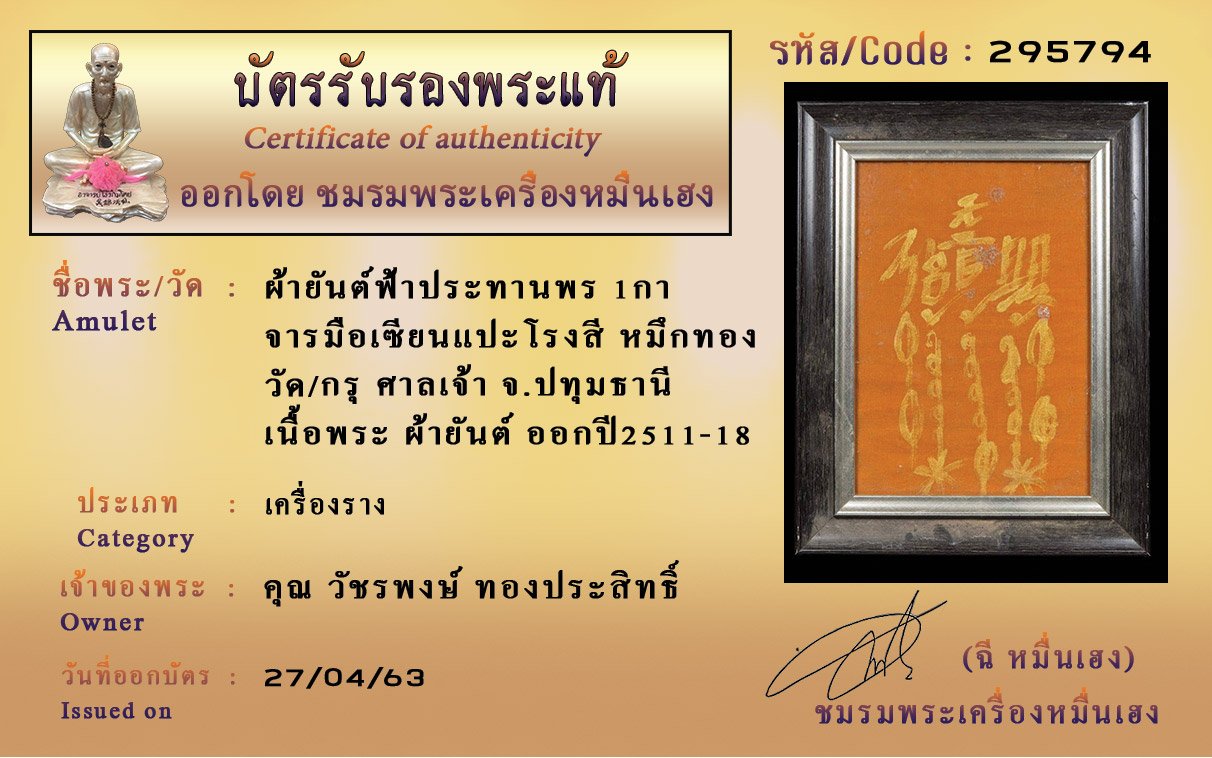 รหัสสินค้า : (295794) ผ้ายันต์ฟ้าประทานพร 1กา จารมือเซียนแปะโรงสี หมึกทอง วัด/กรุ ศาลเจ้า จ.ปทุมธานี เนื้อพระ ผ้ายันต์ ออกปี2511-18